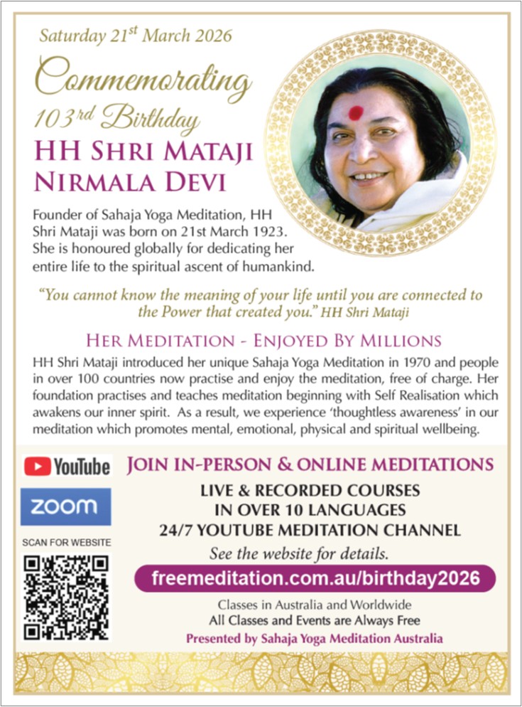 For HH Shri Mataji’s 103rd Birthday, the notice will appear in ‘The Weekend Australian’ newspaper on Saturday 21 March 2026, reaching over 600,000 readers nationwide.