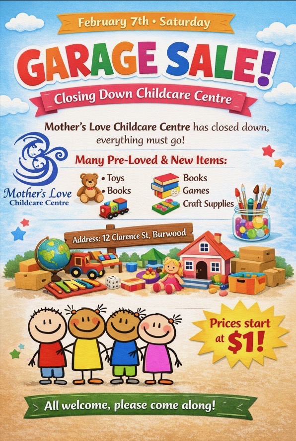 As previously advised, Mother’s Love Childcare Centre closed down in December 2025 and an onsite Garage Sale has been organised for this Saturday.
