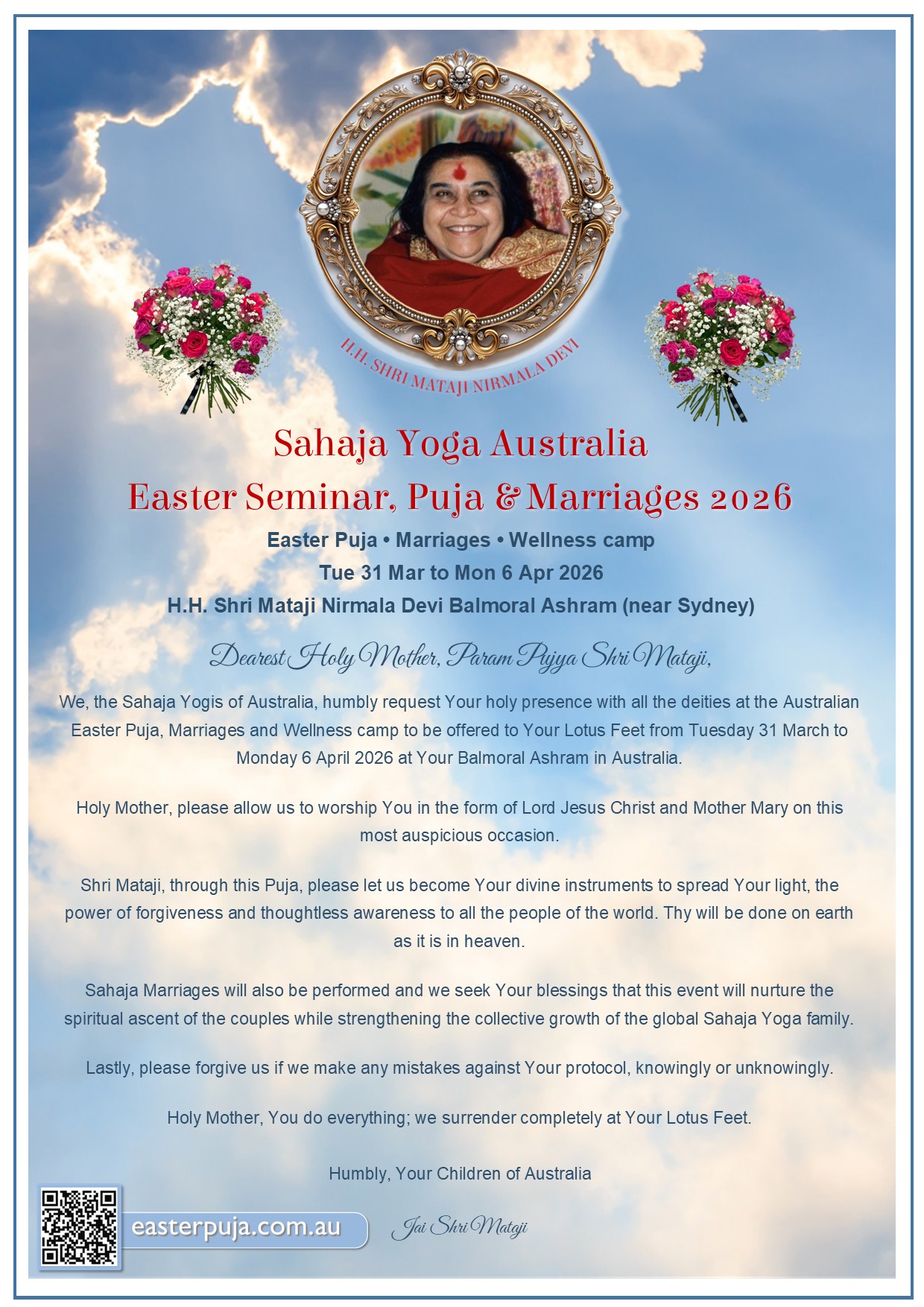 We, the Sahaja Yogis of Australia, humbly request Your holy presence with all the deities at the Australian Easter Puja, Marriages and Wellness camp to be offered to Your Lotus Feet from Tuesday 31 March to Monday 6 April 2026 at Your Balmoral Ashram in Australia.
