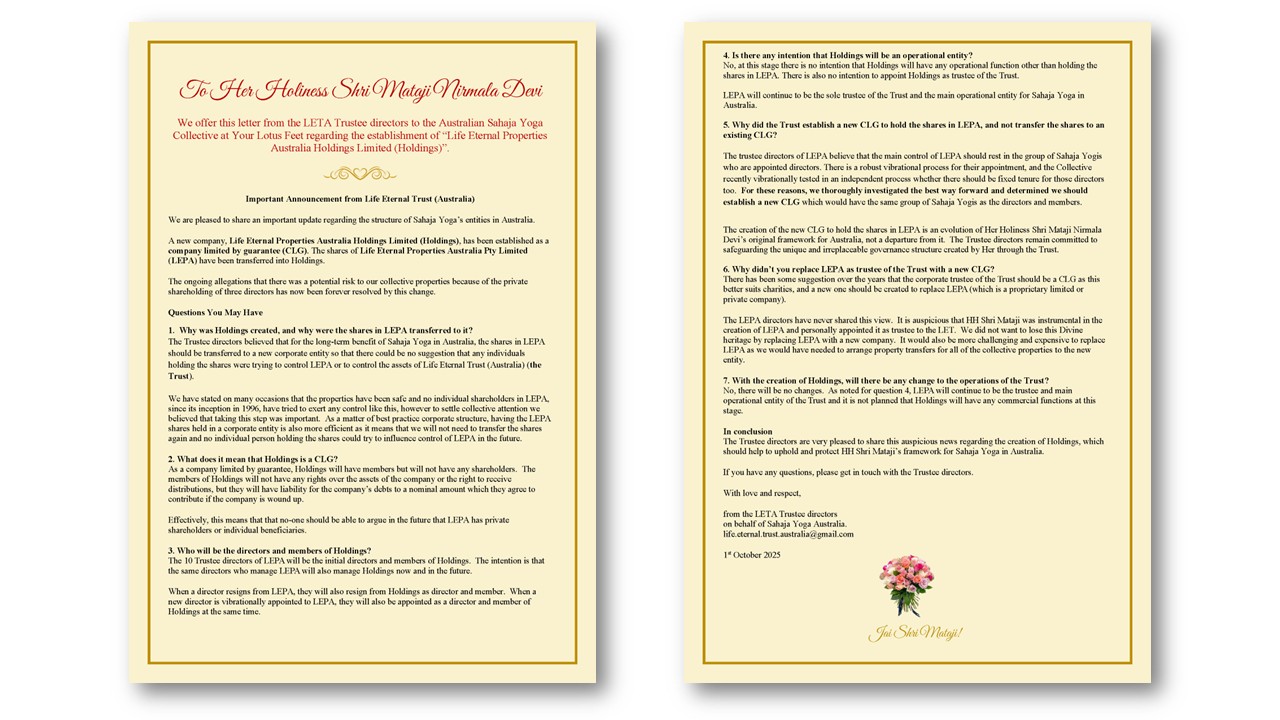 The creation of the new CLG to hold the shares in LEPA is an evolution of Her Holiness Shri Mataji Nirmala Devi’s original framework for Australia, not a departure from it. The Trustee directors remain committed to safeguarding the unique and irreplaceable governance structure created by Her through the Trust.